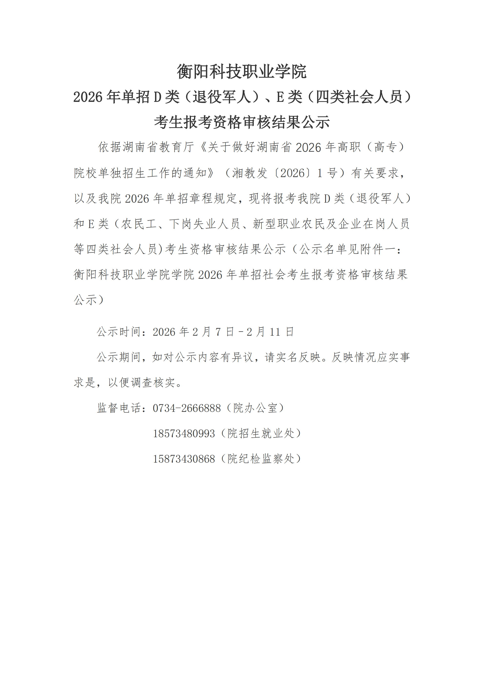 依据湖南省教育厅《关于做好湖南省2026年高职(高专)院校单独招生工作的通知》(湘教发〔2026〕1号)有关要求,以及我院2026年单招章程规定,现将报考我院D类(退役军人)和E类(农民工、下岗失业人员、新型职业农民及企业在岗人员等四类社会人员)考生资格审核结果公示(公示名单见附件一:2026年单招D类(退役军人)、E类(四类社会人员)考生报考…