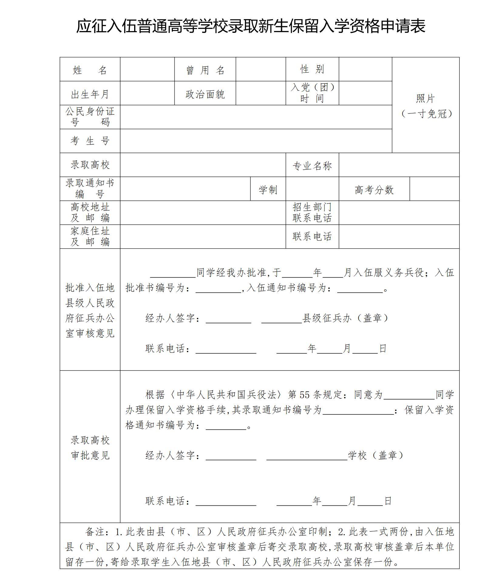 应征入伍普通高等学校录取新生保留入学资格申请表