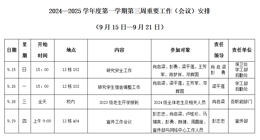 2024—2025学年度第一学期第三周重要工作(会议)安排(9月15日-9月21日)