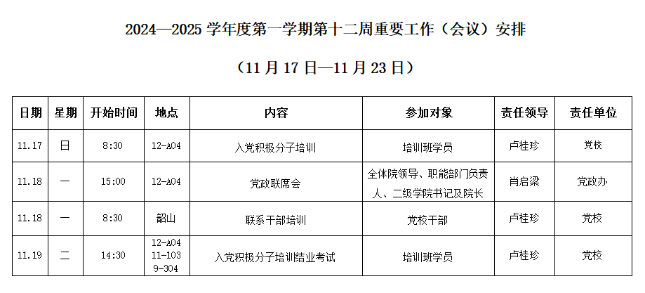 2024—2025学年度第一学期第十二周重要工作(会议)安排(11月17日-11月23日)