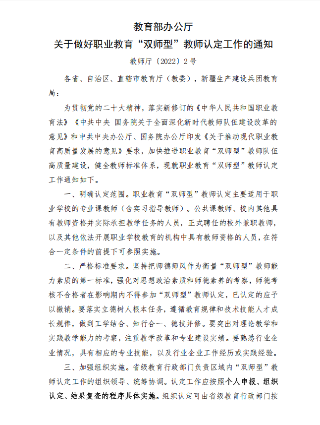 转发教育部办公厅关于做好职业教育“双师型”教师认定工作的通知