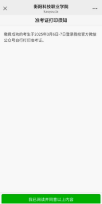 2、阅读准考证打印须知:仔细阅读相关须知,缴费成功的考生需在规定时间内登录我校官方微信公众号自行打印准考证。同时,考生须在湖南省普通高校招生考试考生综合信息平台(网址:https://ks.hneao.cn)或 “潇湘高考” APP 报考我院,方可进行准考证打印操作。