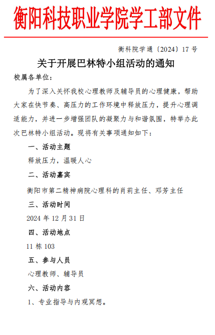 衡科院学通 17号 11月24日关于开展巴林特小组活动的通知