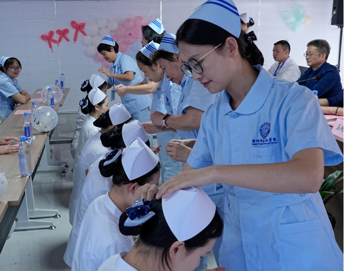 最激动人心的授帽仪式开始,护理前辈们缓步走到学子身旁,轻轻为他们戴上洁白的燕尾帽。这顶帽子,承载着责任与使命,是护理精神的传承与延续。当帽子稳稳地戴在头上,学子们眼中满是坚定与憧憬。