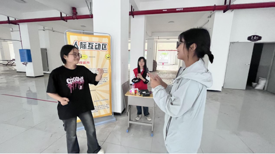 人际互动区成为了友谊升温的催化剂。“勇闯雷阵” 游戏中,蒙眼的同学小心翼翼地迈出每一步,耳边是搭档清晰而温柔的指引:“左前方两步,有障碍物,抬左脚……” 当两人携手冲过终点时,默契的笑容在彼此眼中绽放。