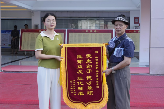 在盛夏的微风中,医药卫生学院迎来了一份特别的暖意——学生家长送来一面红彤彤的锦旗,郑重地交到辅导员吴彩莹老师手中。展开的瞬间,十六个金色大字跃然而出,暖意瞬间溢满了整个校园: