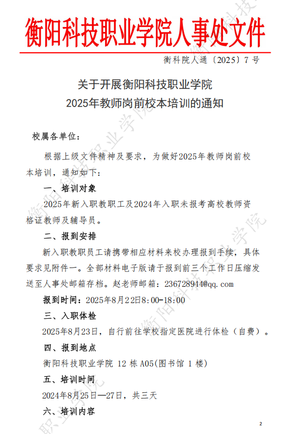 衡科院人通〔2025〕07号关于开展2025年教师岗前校本培训的通知