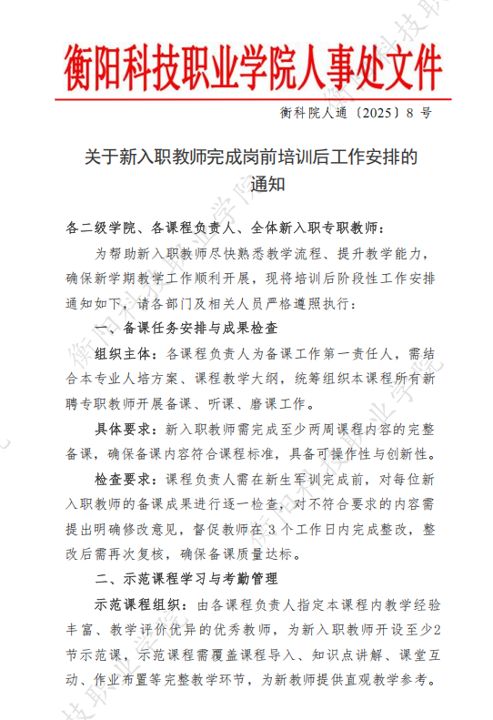 衡科院人通〔2025〕08号关于新入职教师培训后工作安排的通知