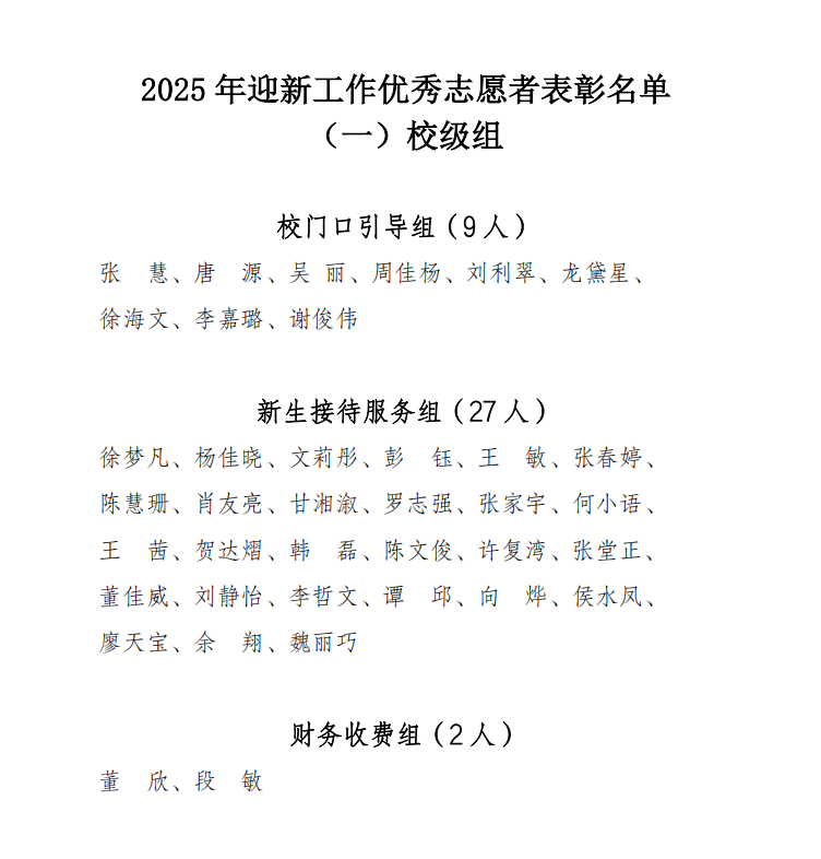 在 2025 年迎新工作中,学生志愿者为 2025 级新生提供了“安全、顺畅、温馨、周到”的迎新服务,协助完成各项新生接待工作,每人累计服务时长超 33 小时,赢得了新生和家长的高度赞赏,展示了开云在线登录app入口学子良好的素养和形象。为表彰先进、弘扬正气、传播正能量,充分发挥青年典型示范引领作用,激发广大青年学子的责任感和使命感,决定授予张慧等 80 名同学迎新工作“优秀志愿者”荣誉称号。 希望受到表彰的同学珍惜荣誉、再接再厉,继续发挥模范带头作用,同时,号召全体同学以他们为榜样,积极参与志愿服务,践行志愿精神,为校园建设贡献力量。 如对拟推对象有异议,请于 2025 年 9 月 12 日 17:00 前向校团委反映,联系人:闵老师,联系地址:11 栋 101 室,逾期不受理。