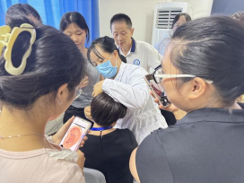 随后,湖南省人民医院杨丽平老师作为主讲人,带领其团队为师生们带来了一场内容充实、生动有趣的学术盛宴。杨丽平老师从耳穴疗法的中医理论基础讲起,深入浅出地阐释了耳朵作为“宗脉之所聚”与全身脏腑经络的密切联系。她重点讲解了如何通过观察耳廓形态、颜色变化来辅助诊断,并详细演示了“耳穴压豆”的标准操作流程、适应证及注意事项。