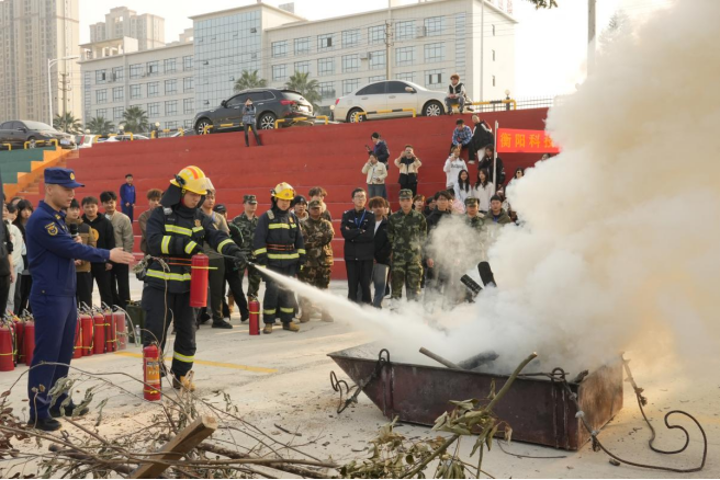 疏散结束后,学院特邀的呆鹰岭消防站站长开展现场教学,系统讲解冬季校园火灾隐患特点、初期火灾处置方法及报警注意事项,并重点演示干粉灭火器“提、拔、握、压”四步操作法。在消防队员的指导下,师生代表轮流上前实操灭火,亲手扑灭模拟火源,切实掌握初起火灾扑救技能。护理专业学生还现场展示了心肺复苏急救流程,为演练增添了应急救援实战环节。