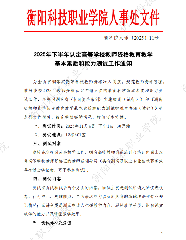 衡科人通【2025】11号 关于开展2025下半年认定高等学校教师资格教育教学基本素质和能力测试工作的通知