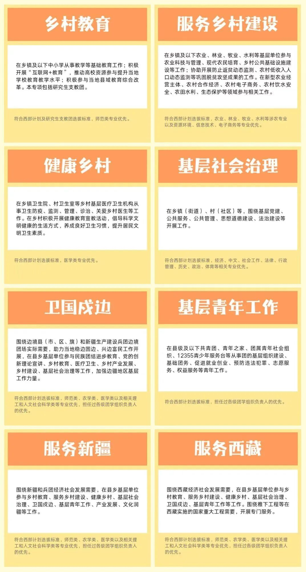 2026年西部计划项目将深入贯彻落实习近平总书记重要回信精神,引导广大高校毕业生积极参加乡村教育、服务乡村建设、健康乡村、基层社会治理、卫国戍边、基层青年工作、服务新疆、服务西藏等8个专项,以青春力量服务国家战略、服务百姓民生、服务社会治理